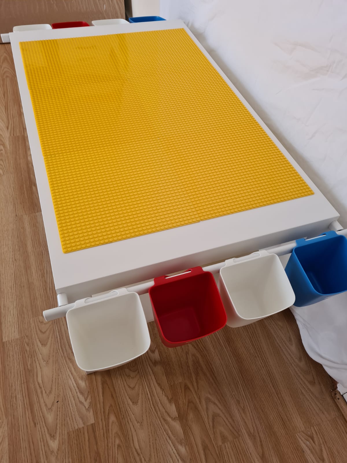 Large LEGO Compatible Play Table. With all yellow baseplates on top, it includes two side rails & eight small tubs and two larger storage bins underneath. This makes building easy, clean up even easier and offers tonnes of storage for all those bricks.